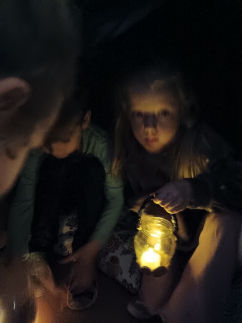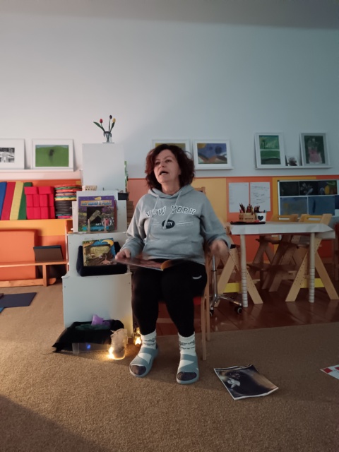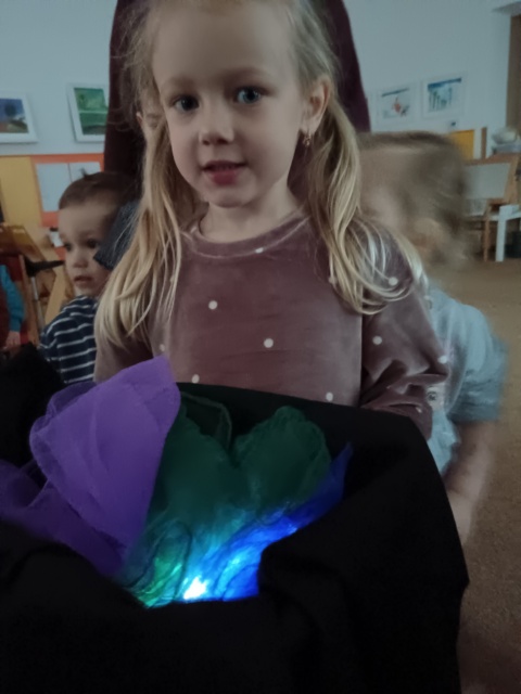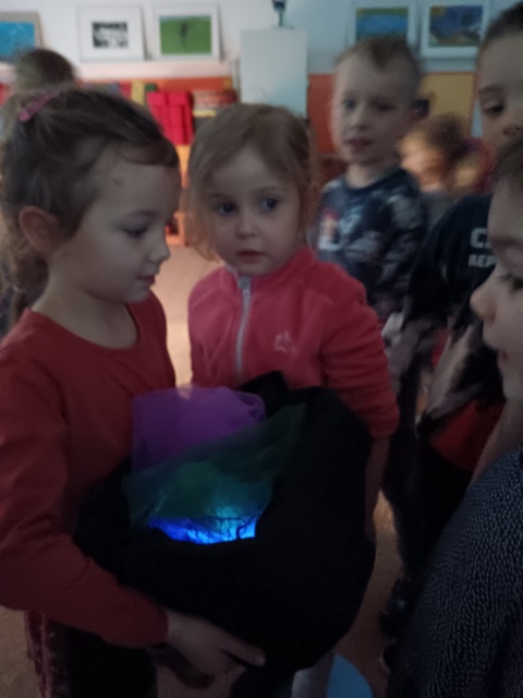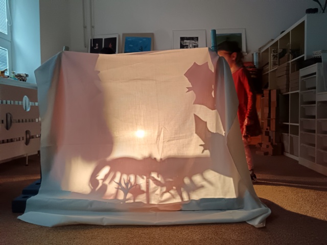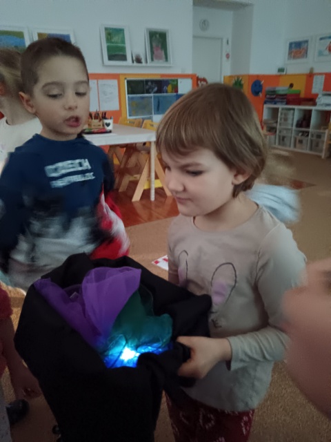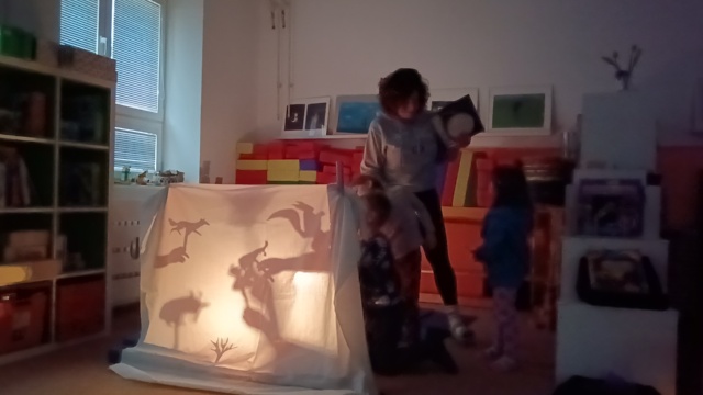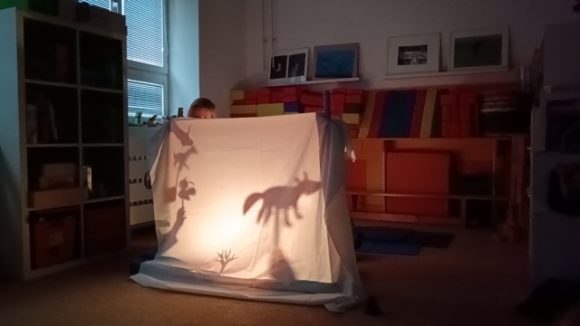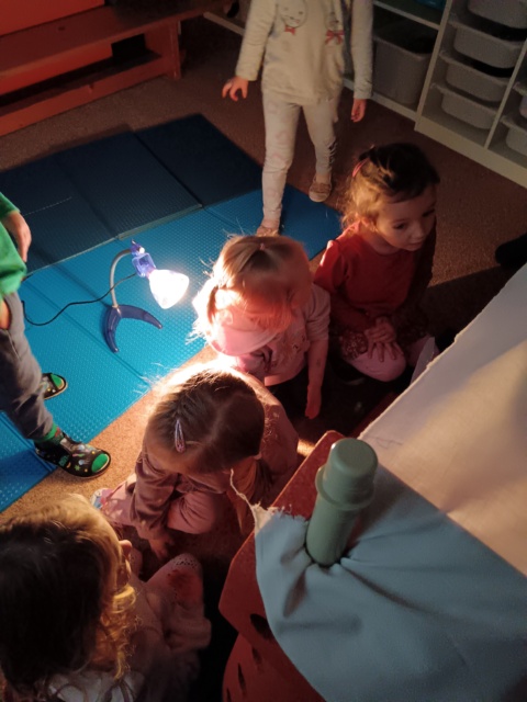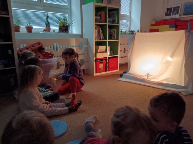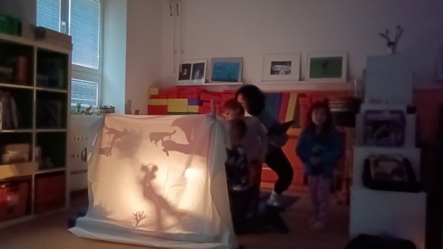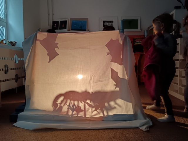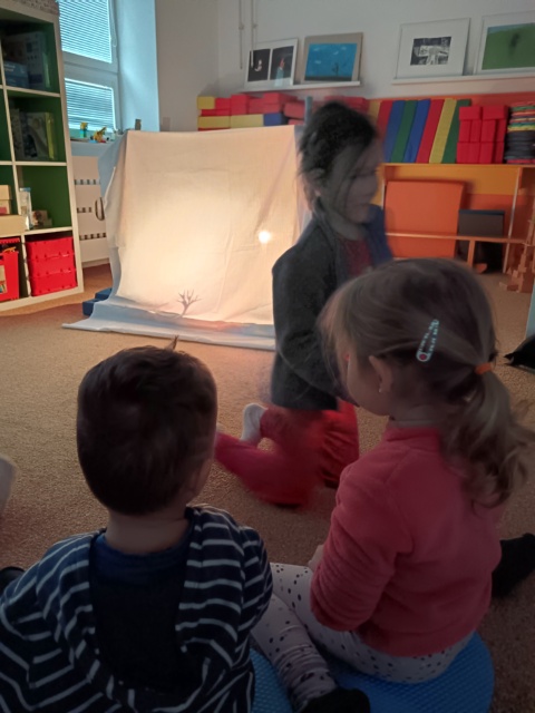 Třída Země si vyrobila papírové loutky, postavila divadlo a zahrála dětem ze třídy Moře stínové divadlo Ela a kouzelné světlo. Děti si potom mezi sebou podávaly světýlko: ,,Tady máš světýlko, paprsek letmý, co zažene strach, když večer se setmí.“