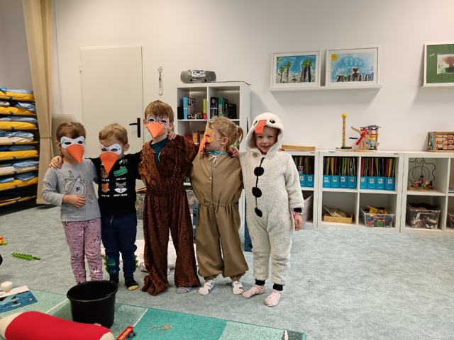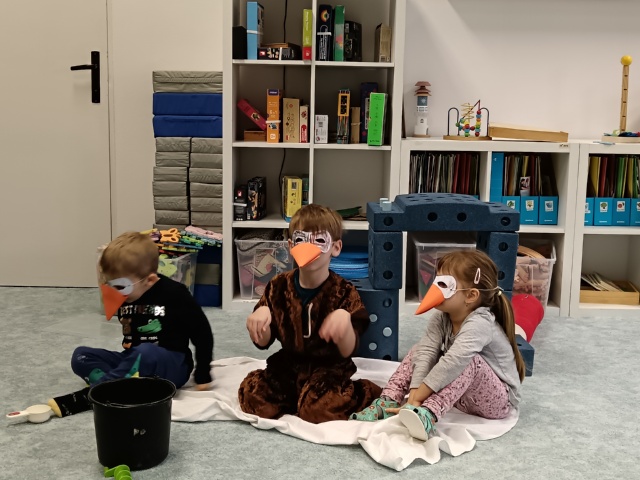 Třída Moře si vyrobila masky vrabečků a zdramatizovala svůj příběh o Nejbohatším vrabci na světe.